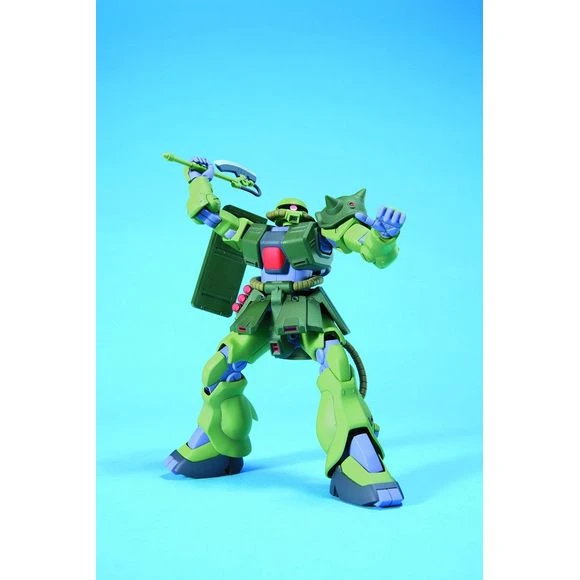 Here’s a sharp HGUC snap-fit plastic kit of MS-06FZ Zaku II FZ (Kai) as it appeared in the “Mobile Suit Gundam 0080: War in the Pocket” OVA series. Molded in color, this kit features polycapped joints and movable skirt armor that allow it to be set in dynamic poses. An optional Zaku B-type head is also included, along with an MMP-80 90mm machine gun, three hand grenades (molded as one part), and a heat hawk. A sheet of foil stickers and a Zeon marking sticker are provided to add detail to the completed model. Assembly Required.