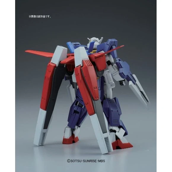 Gundam Age-1 in its final battle configuration at the end of Gundam Age. Back mounted Glastron launchers can be rotated to the front under the shoulder and features dual missile launchers. 2 shield rifles and beam sabers are also included. Armor can be purged to reveal Age-1 Flat.