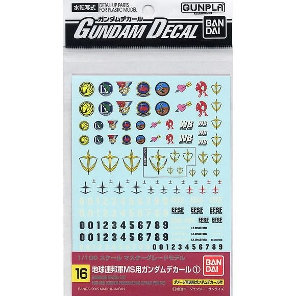 These are high-quality water-slide decals to add custom markings to your 1/100-scale Earth Federation Space Force Gundam kits.