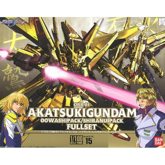 This superb 1/100-scale kit of the Akatsuki Gundam with its gleaming golden parts is irresistible to those who love mechs in shining armor! Akatsuki Gundam comes with two optional packs, which include the Oowashi and Shiranui pack, that can be attached to its back. Armaments include a beam rifle, shield, and two beam sabers that can be connected to form its signature double-bladed beam saber. A display base is included along with custom decals for detailing up your completed kit. All DRAGOON pods can separate from Shiranui pack while Oowashi pack contains deployable rail guns.