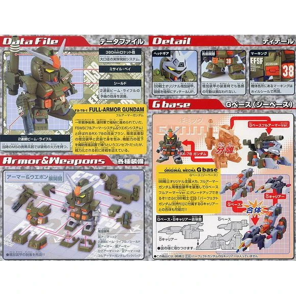The latest entry into the ‘G-Generation Neo’ series of SD Gundam kits, this is the FA-78-1 Full-Armor Gundam. Option parts are included to build a simple RX-78 Gundam (without the backpack and extra armor), or to build the ‘G-Base’, an original mecha design (with one kit you can build ONE of the three variations — not all three). Features snap assembly with no glue or paint required. Parts are molded with great detail (as much as you can reasonably put on an SD kit!), and in color. Stickers are included for detail.