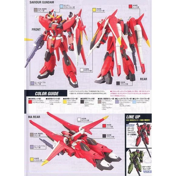 Fantastic high-grade injection-plastic kit of the Saviour Gundam in 1/144 scale. Beautifully-molded all in colour; this coupled with snap-fit assembly means no paint or glue are required. Polycaps make the joints movable; and the completed model can transform into Mobile Armour mode. Foil stickers for detail are also included.